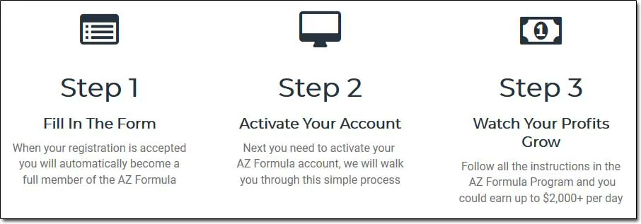 The AZ Formula system, which has allegedly been put together by a guy named Steven Cook basically claims to be a “done-for-you” affiliate profit system. You’re literally told that all you need to do to begin profiting is sign up, activate your account & follow some simple instructions…
