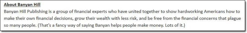 Banyan Hill Publishing claims to be America’s number 1 source for smarter, safer & profitable investing. They have a team of alleged experts & they offer various premium investment-related newsletters which promise to provide their subscribers with lucrative returns.