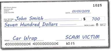 Whilst this scam is now being called the car wrap scam (for obvious reasons), the actual scam behind it – the art of sending a dud cheque & getting the victim to forward money is known as an advance fee scam, and these scams have been around for years.