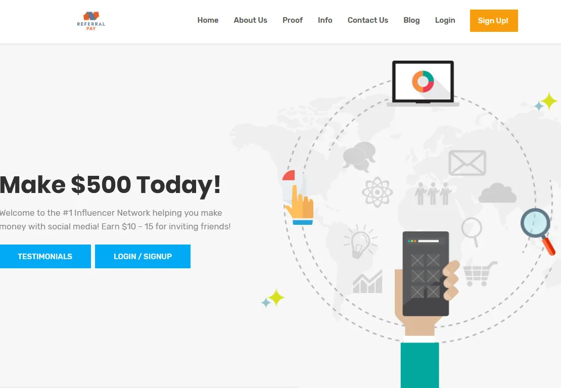 The Referral Pay website (found at ReferralPay.co) claims that you can “start using your influence” and earn hundreds of dollars per day online by simply sharing links on social media …