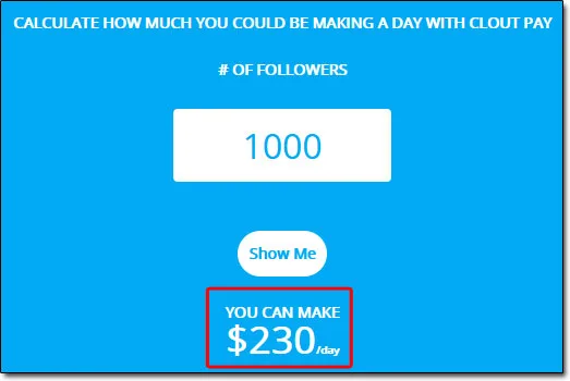And according to the calculator on their homepage you’re also led to believe that with just a mere 1,000 followers you’ll be able to make $230 per day (as shown below):