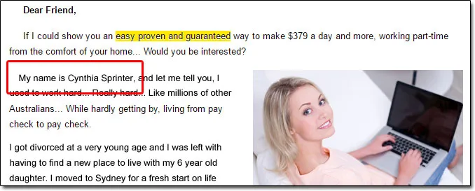 That’s because Cynthia Sprinter is indeed a scam artist. Well, kind of anyway – you see Cynthia Sprinter isn’t actually a real person, it’s a just name that’s been made up by the real scam artist behind these programs to keep their own name safe from negative criticism.
