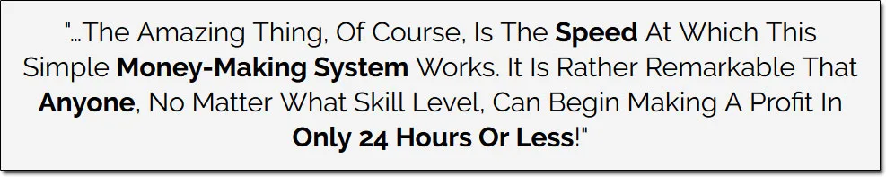 They even claim that you’ll be able to generate your first profits within just a mere 24 hours (as shown below):