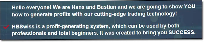 The creators who claim to be named Hans & Bastian state that you don’t need to do anything at all as the system has supposedly been built on a Swiss quality algorithm that will do everything on your behalf so that you can just sit back & earn.
