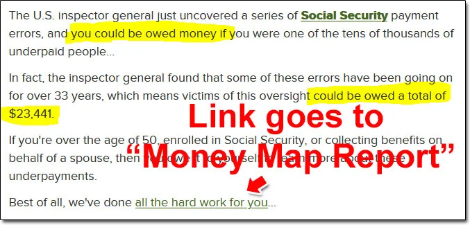 Numerous teasers are floating around online which direct you to sign up for this newsletter. However, we shall only mention the one which intrigued us the most. A promotional teaser related to Money Map Report was recently launched which tells you that you could claim up to $23,441 of unpaid social security.