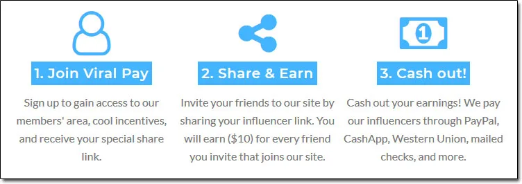 Visitors to the site are led to believe that all they need to do is sign up & share their link in order to make money, with the Viral Pay website stating that they’ll earn a whopping $10 for every member that joins through their link.
